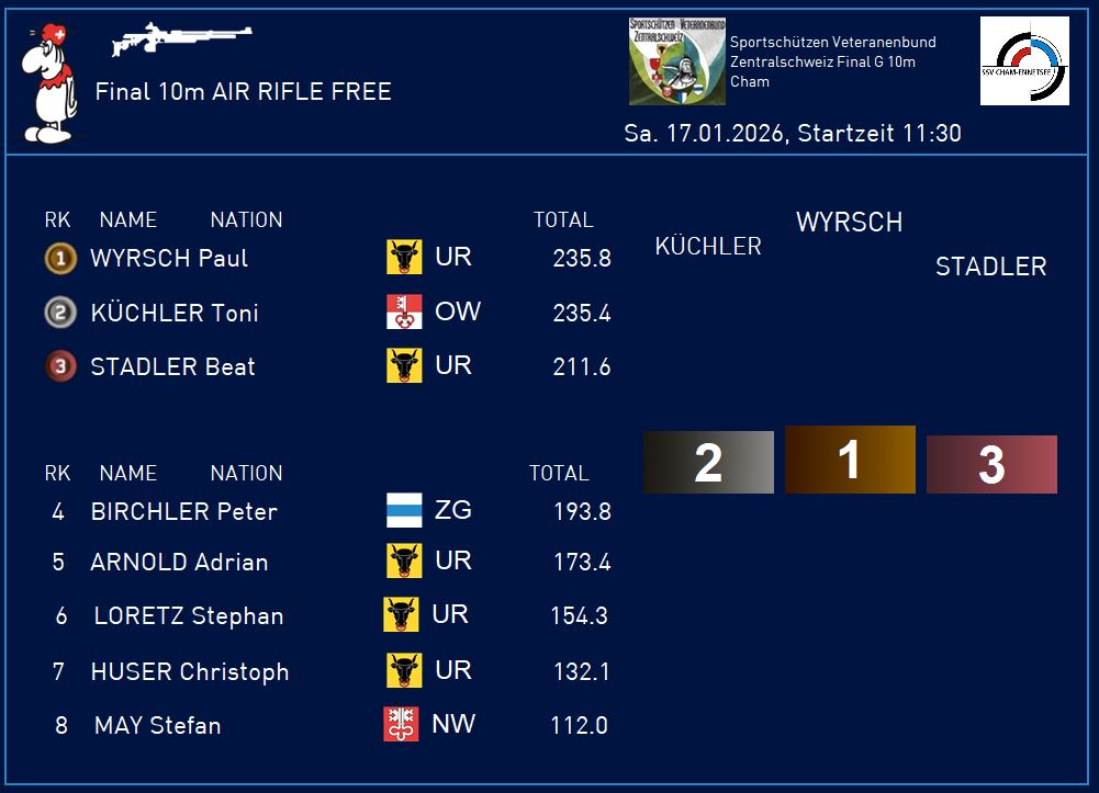 Bereits Mitte Januar ein sportlicher Höhepunkt bei den Zentralschweizer Sportschützenveteranen. Nach der dezentral durchgeführten Heimrunde im Herbst 2025 trafen sich am 17. Januar 2026 die besten Gewehr 10m Schützen in Cham, um unter sich die Ränge 1 bis 10 auszumarchen. Herzliche Gratulation allen Schützen zu den tollen Resultaten und vielen Dank fürs Mitmachen. Ein ganz grosses Dankeschön an die Sportschützen Cham, namentlich an Bruno Gössi und Angela Luthiger, für die perfekte Durchführung des Anlasses. Schande über den Webmaster, der vergessen hat, von den Siegern ein Photo zu schiessen. Es sind dies bei stehend-frei Schiessenden 1. Paul Wyrsch, Schattdorf; 2. Toni Küchler, Sachseln; 3. Beat Stadler, Schattdorf und bei den Auflage-Schützen 1. Robert Graf, Reinach; 2. Peter Schicker, Steinhausen; 3. Josef Ringo Weber, Steinhausen.
