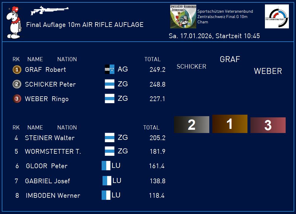Bereits Mitte Januar ein sportlicher Höhepunkt bei den Zentralschweizer Sportschützenveteranen. Nach der dezentral durchgeführten Heimrunde im Herbst 2025 trafen sich am 17. Januar 2026 die besten Gewehr 10m Schützen in Cham, um unter sich die Ränge 1 bis 10 auszumarchen. Herzliche Gratulation allen Schützen zu den tollen Resultaten und vielen Dank fürs Mitmachen. Ein ganz grosses Dankeschön an die Sportschützen Cham, namentlich an Bruno Gössi und Angela Luthiger, für die perfekte Durchführung des Anlasses. Schande über den Webmaster, der vergessen hat, von den Siegern ein Photo zu schiessen. Es sind dies bei stehend-frei Schiessenden 1. Paul Wyrsch, Schattdorf; 2. Toni Küchler, Sachseln; 3. Beat Stadler, Schattdorf und bei den Auflage-Schützen 1. Robert Graf, Reinach; 2. Peter Schicker, Steinhausen; 3. Josef Ringo Weber, Steinhausen.